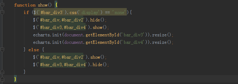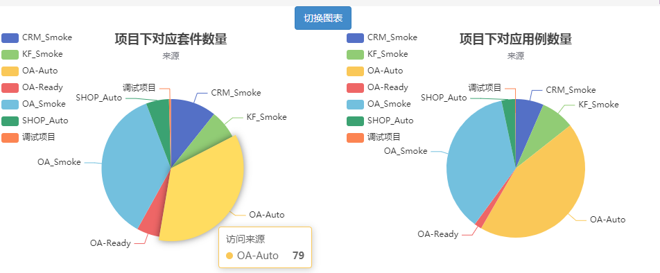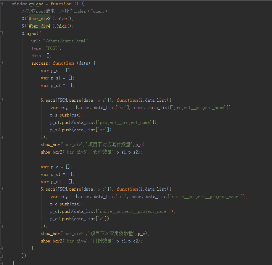 4、编写对应的函数调用方法。本文中做了饼图和柱状图的切换,因此在页面调用函数时先对柱状图做了隐藏,使用ajax调用Django请求获取数据,获取的结果函数在第五条中,返回了对应的字典,如本文中返回的项目对应套件数量及项目对应用例数量的列表字典,然后进行对应的循环生成新的字典放入列表中,列表数据符合option对应data的格式,最后调用生成图表的函数。不善于前端语言的小伙伴可直接在后台生成符合option对应data的格式数据进行返回。