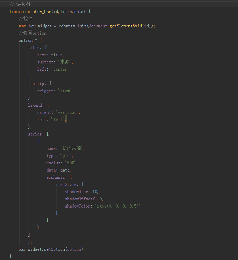 3、编写js函数,根据自己的需求将对应的数据进行参数化。本文例子中将对应展示位置的id,对应图表展示的标题及整个数据字典做了参数化
