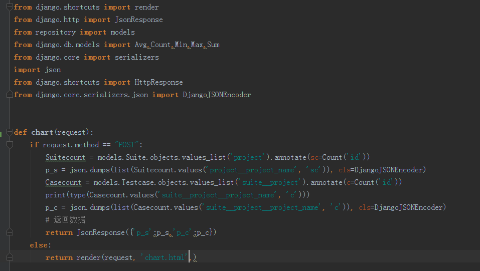 5、对应请求进行数据获取,本文中套件关联项目,使用annotate及Count进行数量统计,统计出字段为项目名称及对应的套件数量,最后使用DjangoJSONEncoder将Queryset对象转为字典格式,使用json.dumps转为标准json格式返回给ajax