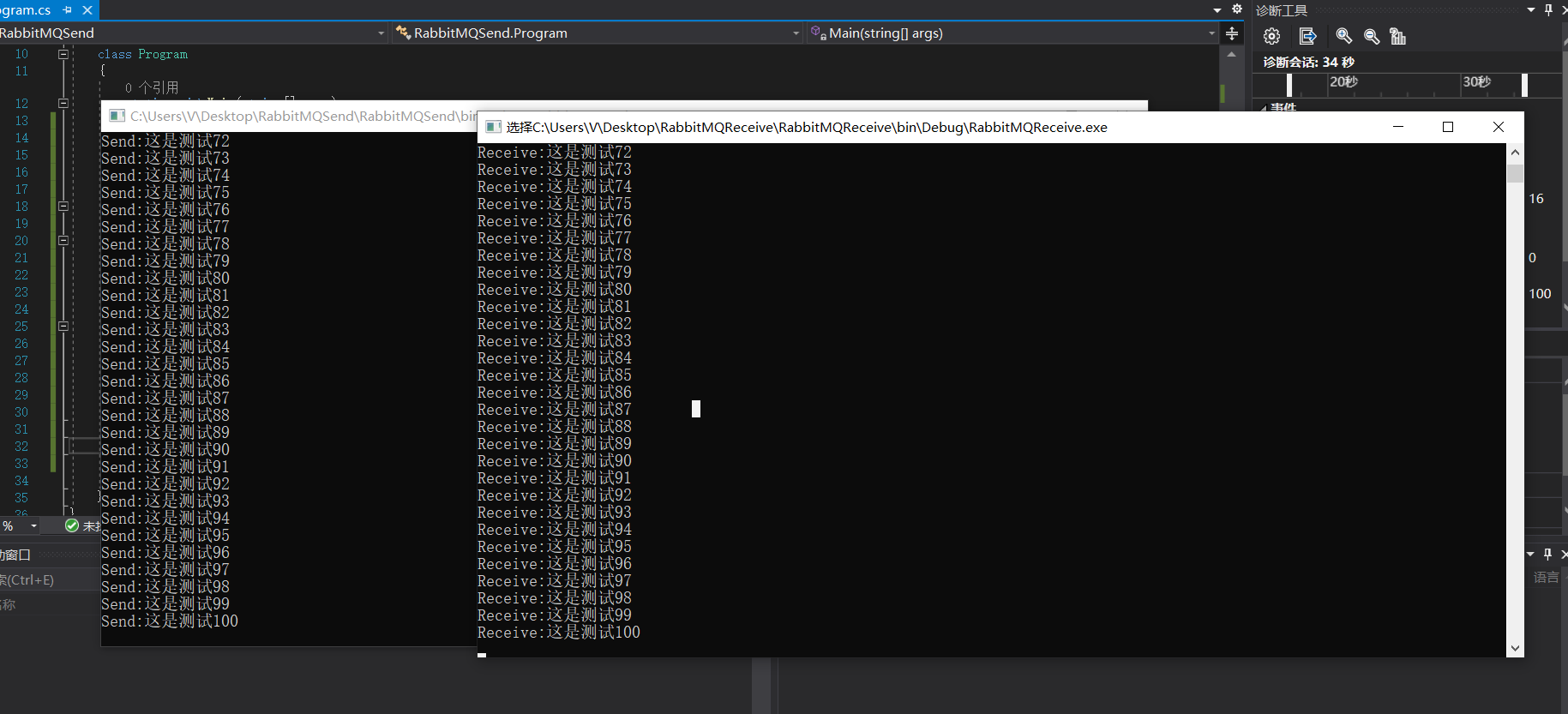 1 using System; 2 using System.Collections.Generic; 3 using System.Linq; 4 using System.Text; 5 using System.Threading.Tasks; 6 using RabbitMQ.Client; 7 8 namespace RabbitMQSend 9 { 10 class Program 11 { 12 static void Main(string[] args) 13 { 14 ConnectionFactory factory = new ConnectionFactory(); 15 factory.HostName = "192.168.3.180";//RabbitMQ主机 16 factory.UserName = "admin";//用户名 17 factory.Password = "admin";//密码 18 using (IConnection Connection = factory.CreateConnection())//连接服务器 19 { 20 using (IModel Model = Connection.CreateModel())//创建通道 21 { 22 Model.QueueDeclare("Test", false, false, false, null);//创建一个名称为Test的消息队列 23 IBasicProperties basicProperties = Model.CreateBasicProperties(); 24 basicProperties.DeliveryMode = 1; 25 for (int i = 1; i <= 100; i++) 26 { 27 string Message = "这是测试" + i; 28 Model.BasicPublish("", "Test", basicProperties, Encoding.UTF8.GetBytes(Message)); //生产者发送消息(写数据) 29 Console.WriteLine($"Send:{Message}"); 30 } 31 } 32 } 33 Console.ReadLine(); 34 } 35 } 36 }