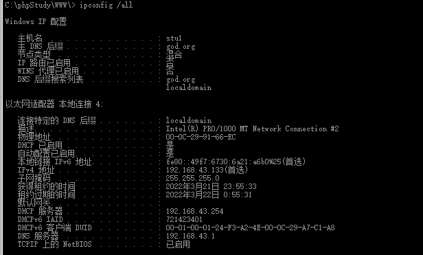 存在域god.org 并且有两张网卡,192.168.43.1/24是攻击机与WEB模拟的外网网卡,另外还有一张192.168.52.1/24网卡