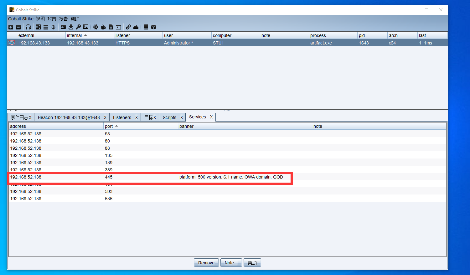 目标处查看域内另外两台主机的开放端口