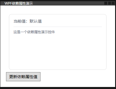 <Window x:Class="WpfDependencyPropertyExample.MainWindow" xmlns="http://schemas.microsoft.com/winfx/2006/xaml/presentation" xmlns:x="http://schemas.microsoft.com/winfx/2006/xaml" xmlns:d="http://schemas.microsoft.com/expression/blend/2008" xmlns:mc="http://schemas.openxmlformats.org/markup-compatibility/2006" xmlns:local="clr-namespace:WpfDependencyPropertyExample" mc:Ignorable="d" Title="WPF依赖属性演示" Height="300" Width="400"> <Grid Margin="20"> <!-- 自定义控件实例 --> <local:MyUserControl x:Name="userControlDemo" Margin="0 0 0 30"/> <!-- 操作按钮 --> <Button Content="更新依赖属性值" Click="ChangeValueButton_Click" Padding="10 6" FontSize="14" HorizontalAlignment="Left" VerticalAlignment="Bottom"/> </Grid> </Window>