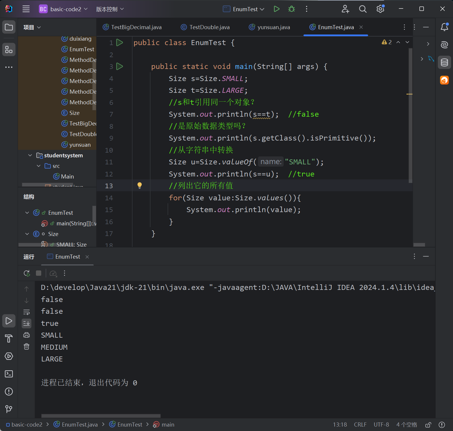 4.Size u = Size.valueOf("SMALL"); 这行代码通过字符串 “SMALL” 获取到 Size 枚举中对应的实例,并赋值给 u。