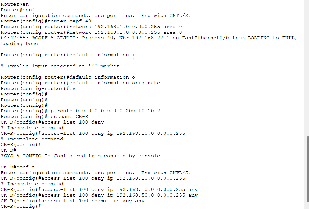 问题:输入 access-list 100 deny ip 192.168.10.0 0.0.0.255 时报错 % Incomplete command。