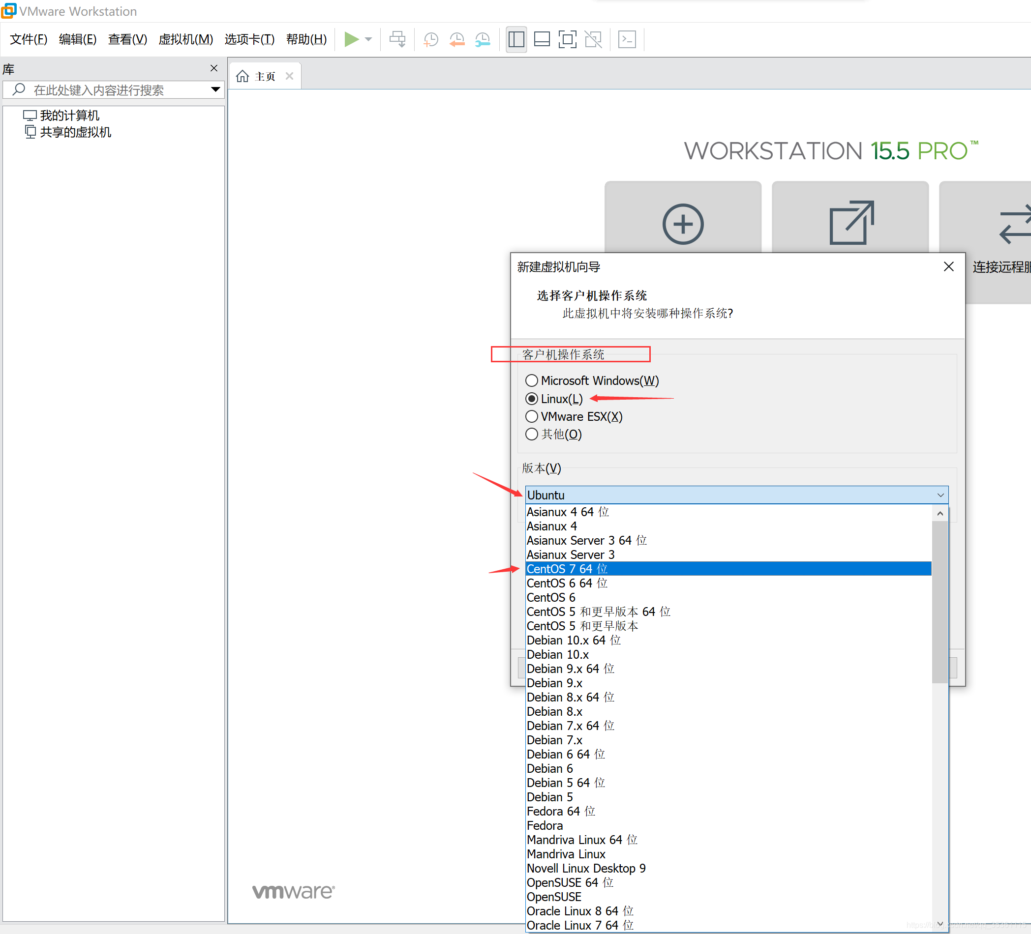 在下图中,我们在 客户系统中选择:Linux, 在版本中 选择:CentOS 7 64位: