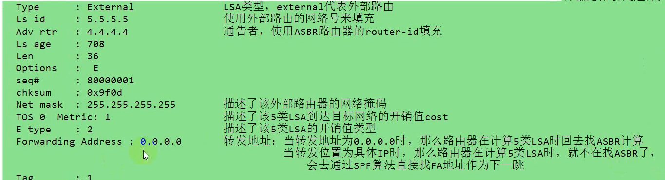 5类LSA 当我们在OSPF进程中,使用了import-route命令后,就会将路由表中的其他协议的路由引入进ospf中,引入后以5类LSA存在于LSDB中 5类LSA是在整个ospf区域中泛洪,不基于区域泛洪。也就是说,只要路由器建立了FULL关系,那么就会传递5类LSA。 4类LSA 当使用了import-route命令以后,路由器会在自己的1类LSA中将ASBR置位,那么当区域中的ABR路由器收到这条置位ASBR的1 类LSA后,会根据这条1类LSA生成一条4类LSA在其他直连区域中泛洪。 4类LSA相当于介绍信,帮助其他区域的路由器在计算5类LSA时,指引了ASBR在哪里。