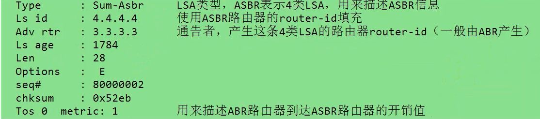 1、当ospf路由器使用了命令import-route以后,那么路由器就会在自己的1类LSA中置位ASBR。不论他是否真的引入外部路由。 2、R4在import-route命令敲完以后,就会在区域内触发更新自己的1类LSA,置位ASBR 3、当R3收到这条ASBR置位的1类LSA后,由于自身是一台ABR,那么他就会根据这条ASBR置位的1类LSA生成一条4类LSA,在其它直连区域内进行传递。如果自身不是ABR角色,那么将不具备生成4类LSA的能力。 生成4类LSA的目的是为了,让其它区域的路由器在计算5类LSA时,可以找到ASBR在哪,所以4类LSA被认为是 ASBR的介绍信 4、当ABR收到了4类LSA后,会将4类LSA的通告者换成自己后,在其他直连区域内进行传递,目的是为了让其它区域内的路由器可以计算出5类LSA