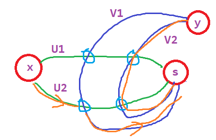 由点双连通图的性质,我们知道 \(x\to s\)、\(s\to y\) 分别存在两条不交的简单路径,我们令 \(x\to s\) 的分别为 \(U_1,U_2\),\(s\to y\) 的分别为 \(V_1,V_2\),现在我们说明,使用这些路径能构造出我们想要的路径。