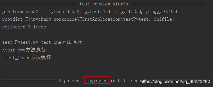 我们把断言改成正确的,再运行一次,结果如下图:尽管我们的用例正常运行通过,但是仍被标记为xpassed,而不是passed。