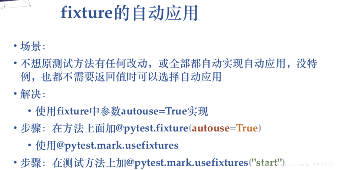 4.把函数声明为fixture :在函数前面加上 @pytest.fixture(作用级别=默认为function)