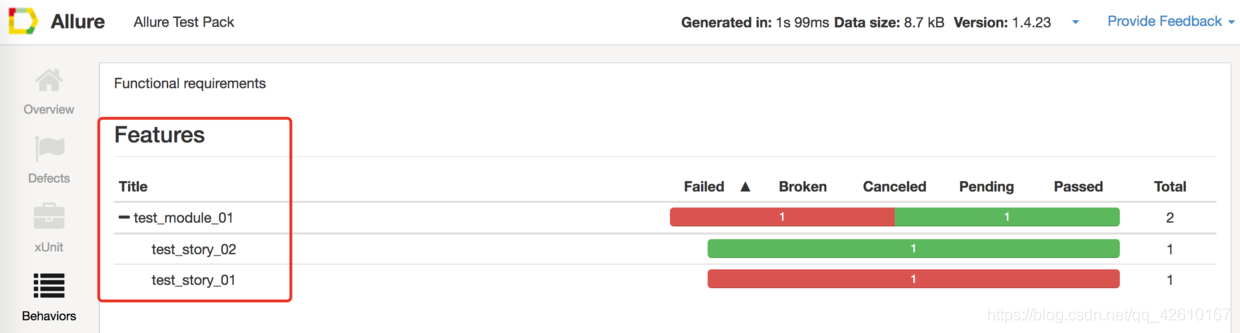 # -*- coding: utf-8 -*- # @Time : 2018/8/17 上午10:10 # @Author : WangJuan # @File : test_case.py import allure import pytest @allure.feature('test_module_01') @allure.story('test_story_01') def test_case_01(): """ 用例描述:Test case 01 """ assert 0 @allure.feature('test_module_01') @allure.story('test_story_02') def test_case_02(): """ 用例描述:Test case 02 """ assert 0 == 0 if __name__ == '__main__': pytest.main(['-s', '-q', '--alluredir', './report/xml'])