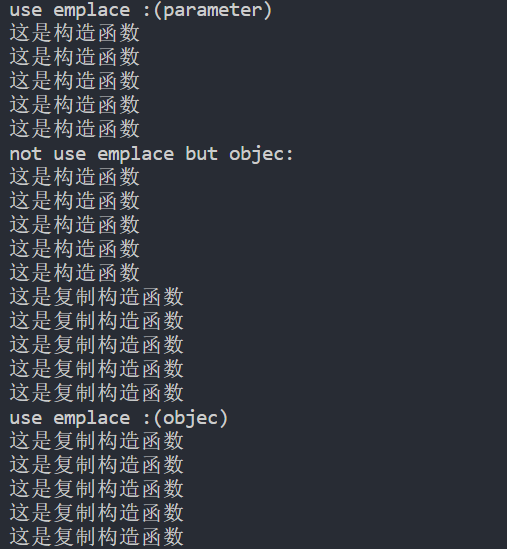 - 当emplace_back()和push_back()追加已经构造好的对象时,两者没有区别,都会调用拷贝构造。