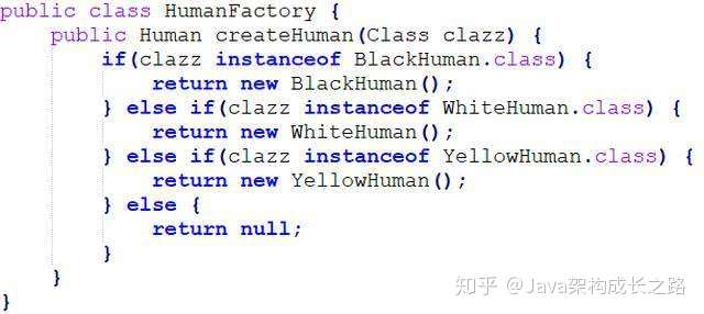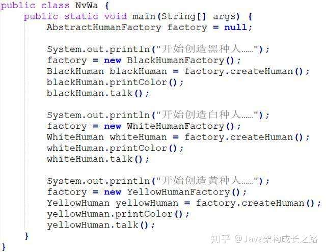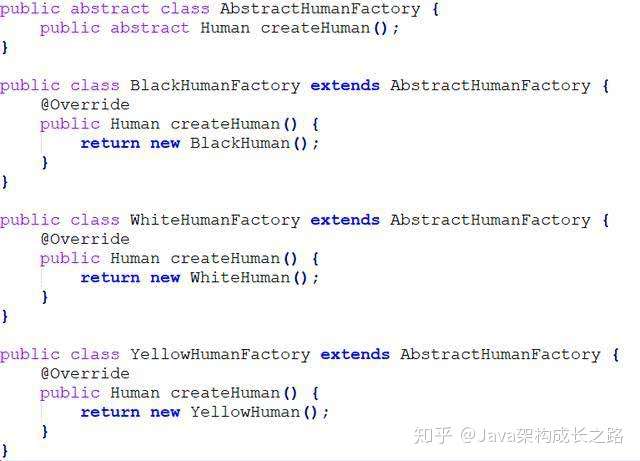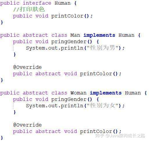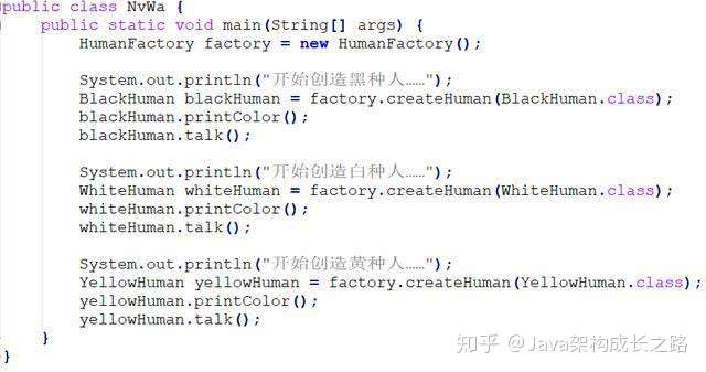 其中,Human接口及其子类的代码不变,增加了一个抽象工厂AbstractHumanFactory,里面定义了一个造人的方法 createHuman(),具体创造什么类型的人由其子工厂实现。