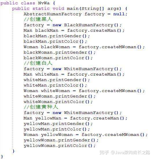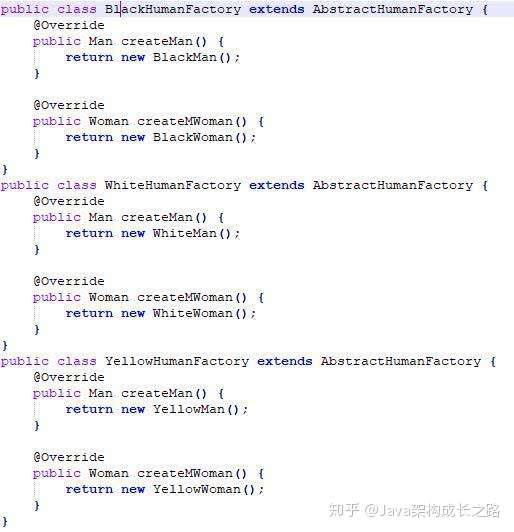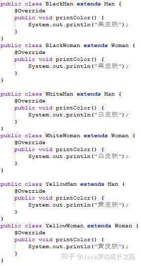 抽象工厂我们定义了两个方法,createMan() 和 createWoman()用来表示生产男人和女人,不管男人或女人,都有不同的肤色,所以我们定义了三个子工厂用来创建不同肤色的人(包括男人和女人),这三个子工厂重写了父类工厂的两个方法。具体实现代码如下。