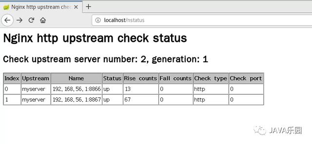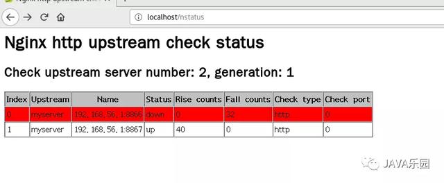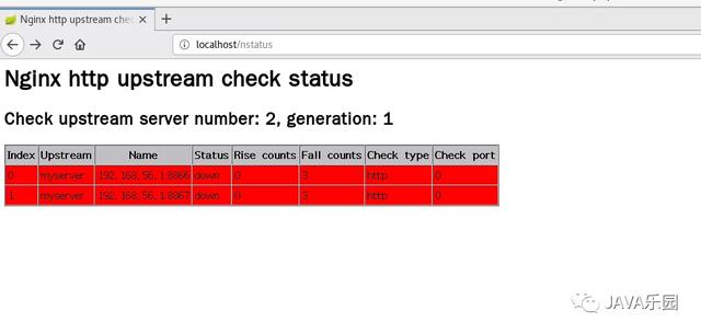 通过http://localhost:80/nstatus 查看,刚开始后端两个节点都处于停止状态,status为down