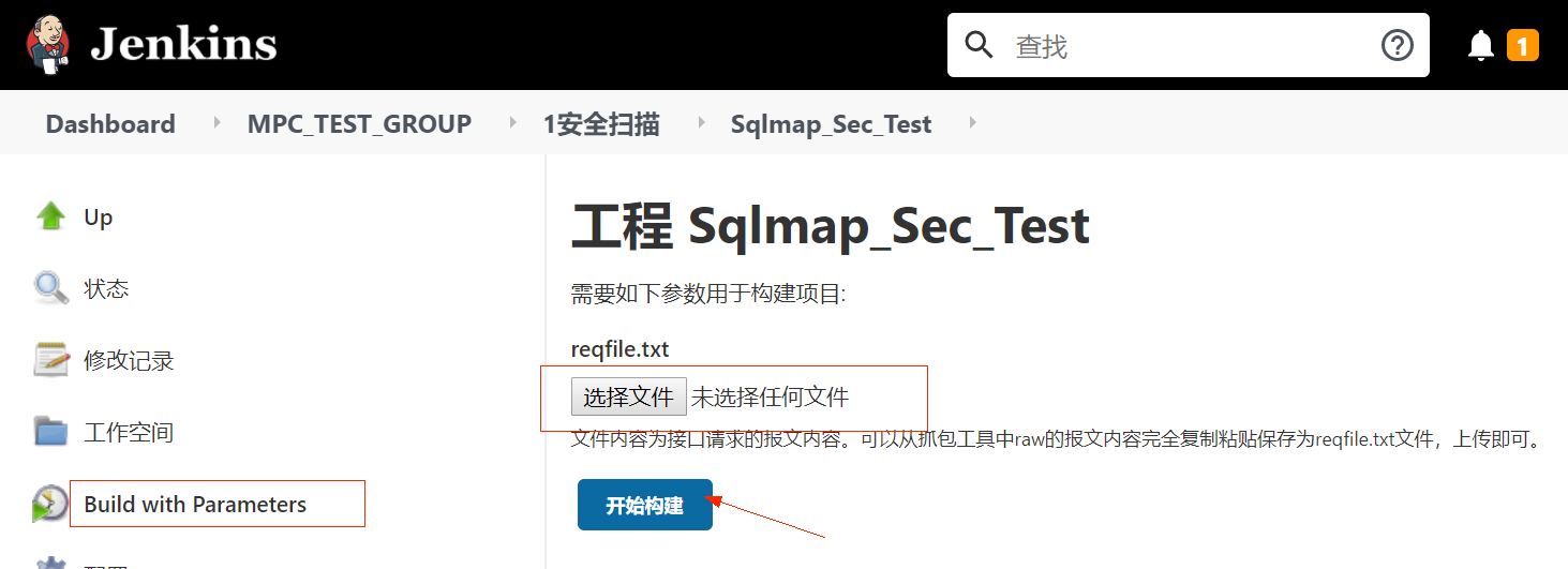 新增构建参数为文件参数,上传接口请求报文保存的txt文件,在工程中新增execute shell,命令为第三步的命令即可。