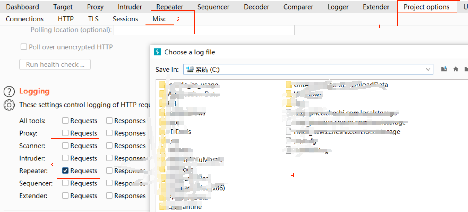 Project options--Misc--Logging--勾选proxy 后的request,弹出框中选择日志保存的路径,并命名日志文件。