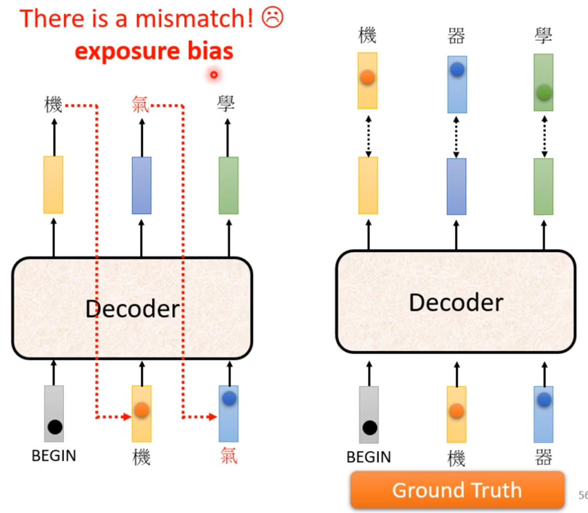 一个可以的解决方案是训练时给Decoder一些错误的东西。(Scheduled Sampling)