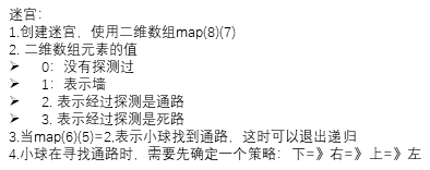 package chapter05 object test03 { def main(args:Array[String]):Unit={ //1.创建迷宫,使用二维数组map(8)(7) val map = Array.ofDim[Int](8,7) //2.给地图加墙 //0:没有探测过 //1:表示墙 //2. 表示经过探测是通路 //3. 表示经过探测是死路 //最上边和下边加墙 for(i <- 0 until 7){ map(0)(i)=1 map(7)(i)=1 } //最左边和最右边加墙 for(i <- 0 until 6){ map(i)(0)=1 map(i)(6)=1 } map(3)(1)=1 map(3)(2)=1 map(2)(2)=1 println("迷宫的情况是:") for(row <- map){ for (item <- row){ printf("%d ",item) } println() } setWay(map,1,1) println("迷宫的情况是:") for(row <- map){ for (item <- row){ printf("%d ",item) } println() } //编一个方法,探测该点是否可以走 // map:地图,i探测位置的横坐标,j 探测位置的纵坐标 def setWay(map:Array[Array[Int]],i:Int,j:Int): Boolean ={ if(map(6)(5)==2){//路走通 return true }else{//map的可能取值为0,1,3 if(map(i)(j)==0){//说明该点还没有探测过 //使用策略探测该点(下=》右=》上=》左) //假定这个点是走的通map(i)(j)=2 map(i)(j)=2 if(setWay(map,i+1,j)){//向下 return true }else if(setWay(map,i,j+1)){//向右 return true }else if(setWay(map,i-1,j)){//向上 return true }else if(setWay(map,i,j-1)){//向左 return true }else{ //说明四个方向都走不通,假设错误 map(i)(j)=3 return false } }else{//1,2,3 return false } } } } }