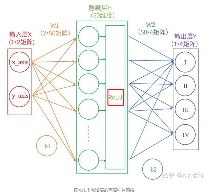 假如经过公式H=X*W1+b1计算得到的H值为:(1,-2,3,-4,7...),那么经过阶跃函数激活层后就会变为(1,0,1,0,1...),经过ReLU激活层之后会变为(1,0,3,0,7...)。