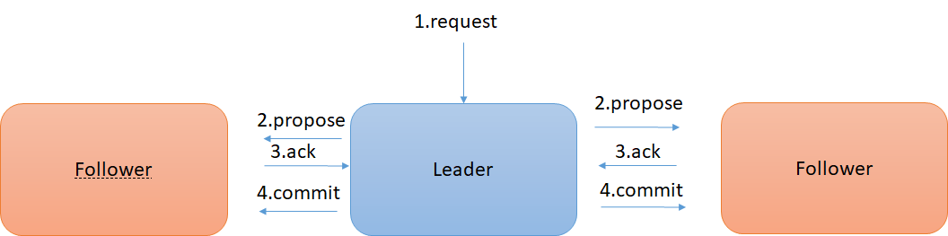 针对客户端请求,Leader服务器会生成对应的事务Proposal,并将其发送给集群中其余所有的Follower服务器,然后再分别收集选票ack,最后进行事务提交commit。