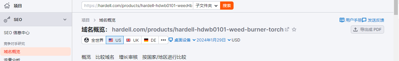 其次在“域名概览”当中输入你所要查询的网址,记得选择你所要查询的地区或者国家,因为关键词在不同地区和国家的排名不同,我们以https://hardell.com/products/hardell-hdwb0101-weed-burner-torch在美国为例作分析。