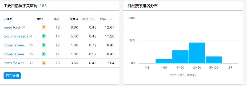 然后点击“主要自然搜索关键词”当中的“查看详情”,就能看到此页面上所承载的关键词在美国的排名和预计流量及所占页面流量的百分比。
