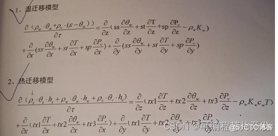 在建模过程中,需要将地下换热器划分为若干个小单元(如网格单元),每个单元内的温度变化可以用离散化方程来描述。通过迭代计算,可以得到每个单元在不同时刻的温度值,从而模拟地下换热器的传热过程。其中湿,热迁移模型如下所示: