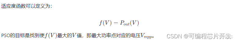 在光伏发电系统中,将PSO应用于MPPT,首先需要定义一个适应度函数(或目标函数),该函数反映的是光伏阵列输出功率与工作点的关系。一般情况下,这个函数可以简化为光伏阵列的输出功率Pout与电压V的关系,即寻找Pout(V)=I(V)⋅V的最大值点,其中I(V)是对应于电压V的电流。