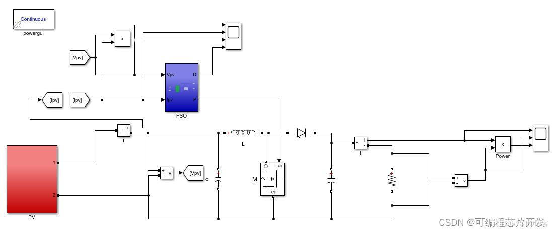 基于PSO优化的PV光伏发电系统simulink建模与仿真。其中PSO采用matlab编程实现,通过simulink的函数嵌入模块,将matlab调用进simulink中。