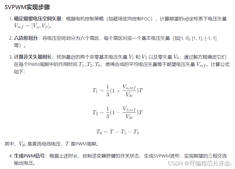 SVPWM的核心思想是将逆变器输出的三相电压矢量在两相静止坐标系(αβ坐标系)中表示,通过控制这些电压矢量的合成效果,精确地追踪期望的圆形电压空间矢量轨迹,以实现对交流电机的高效控制。SVPWM相比传统的脉宽调制(PWM),能更充分利用直流母线电压,提高输出电压的谐波质量,进而提高电机的转矩密度和效率。