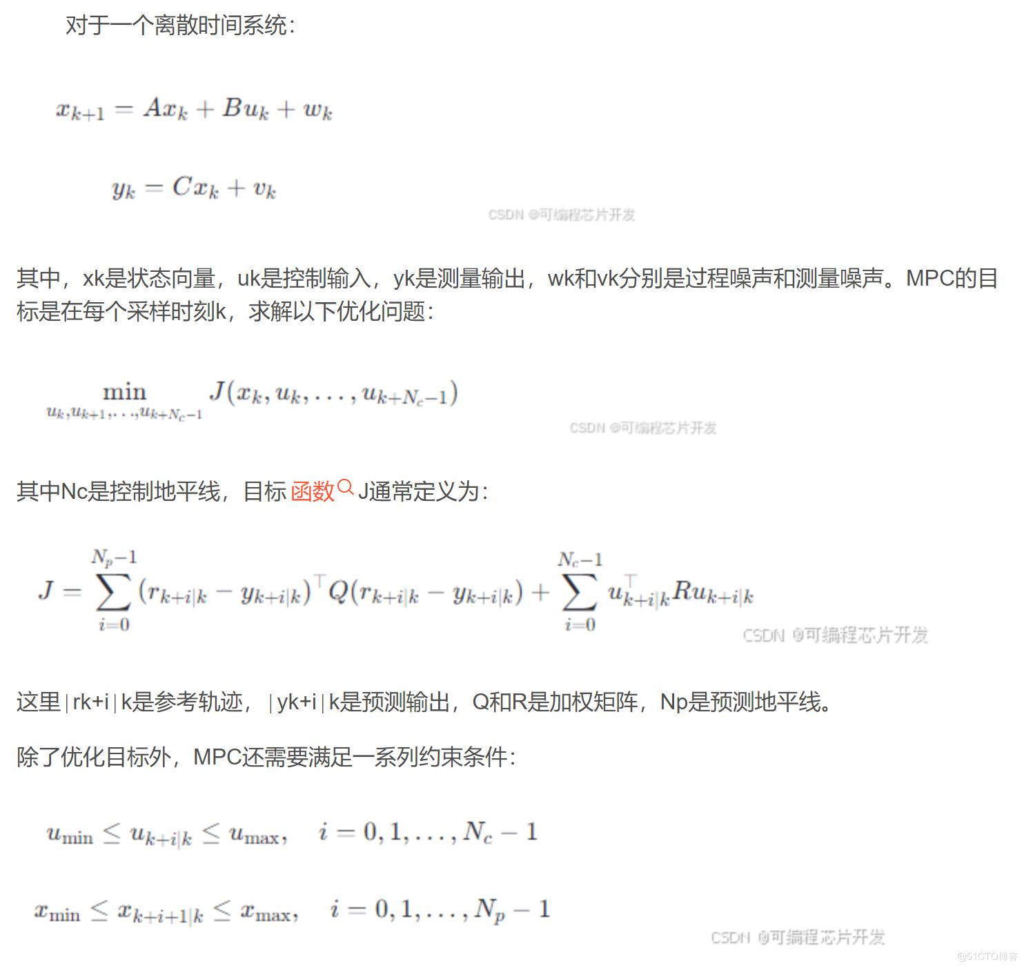 模型预测控制是一种基于模型的优化控制方法,它利用过程模型预测未来行为,并通过求解一个优化问题来确定最优控制序列。MPC的特点在于它能够处理系统的动态特性、输入输出约束,并且可以考虑预测模型的不确定性。