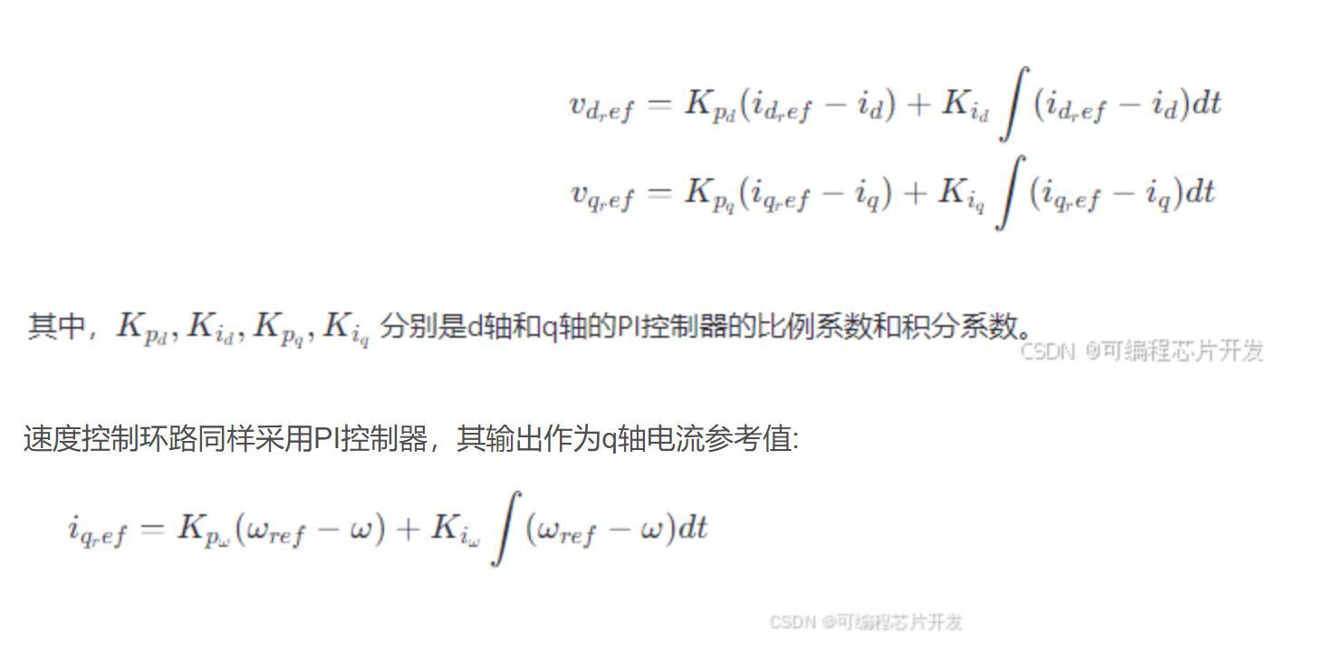 电流控制环路由两个PI控制器组成,它们分别控制d轴和q轴电流。控制器输出的电压参考值为: