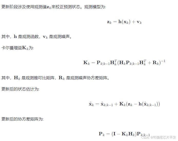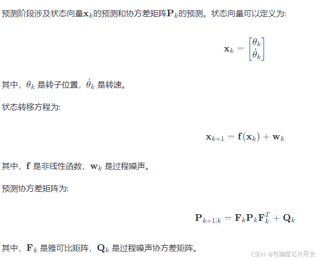 扩展卡尔曼滤波器是一种非线性状态估计器,它可以用来估计PMSM的状态变量,例如转子位置θ和转速ω。EKF的基本步骤包括预测和更新阶段。