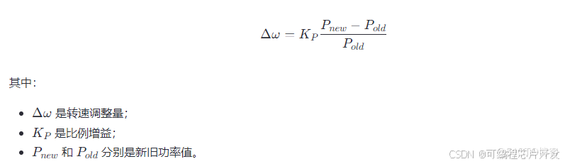 最大功率点跟踪 (MPPT) 控制的目标是在不同的风速条件下使风力发电机运行在其最大功率点上,以提高能量转换效率。爬山法 MPPT 是一种常用的方法,它通过不断调整发电机的转速来跟踪最大功率点。爬山法 MPPT 通过测量发电机的输出功率和转速,根据功率的变化来调整发电机的转速。如果功率增加,则继续朝相同方向调整转速;如果功率减少,则反向调整转速。爬山法 MPPT 可以用以下公式表示: