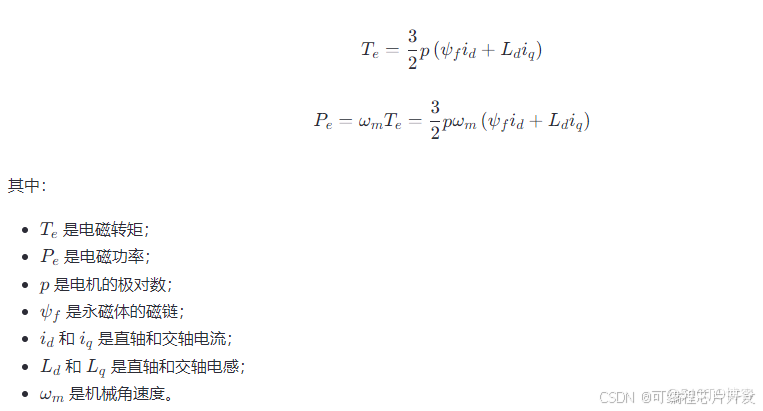直驱式永磁同步风力发电机是一种直接与风轮相连的发电机,无需齿轮箱,因此具有更高的效率和可靠性。PMSG 的电磁转矩和输出功率可以通过以下方程表示: