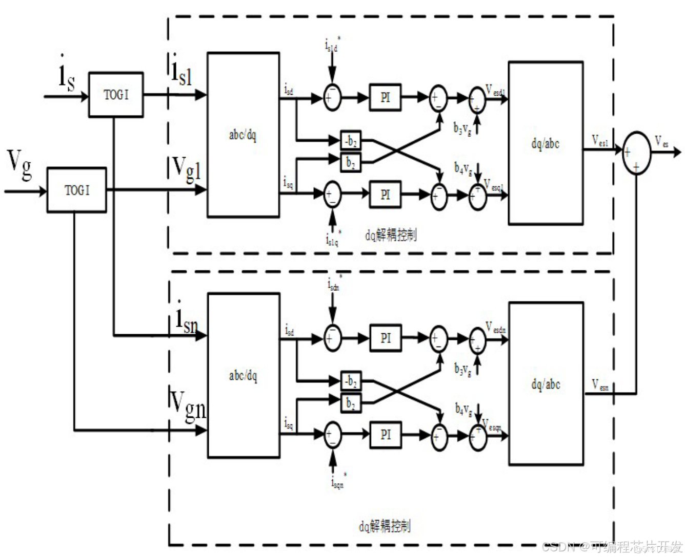 基于三阶广义积分器 PFC 的电气弹簧控制策略的基本思想是:通过三阶广义积分器对电源电流进行处理,提取出电源电流中的基波成分和谐波成分。然后,根据控制目标,对电源电流中的基波成分和谐波成分进行分别控制,实现对电源的功率因数校正和电压稳定控制。基于三阶广义积分的PFC控制策略的系统结构如下图所示: