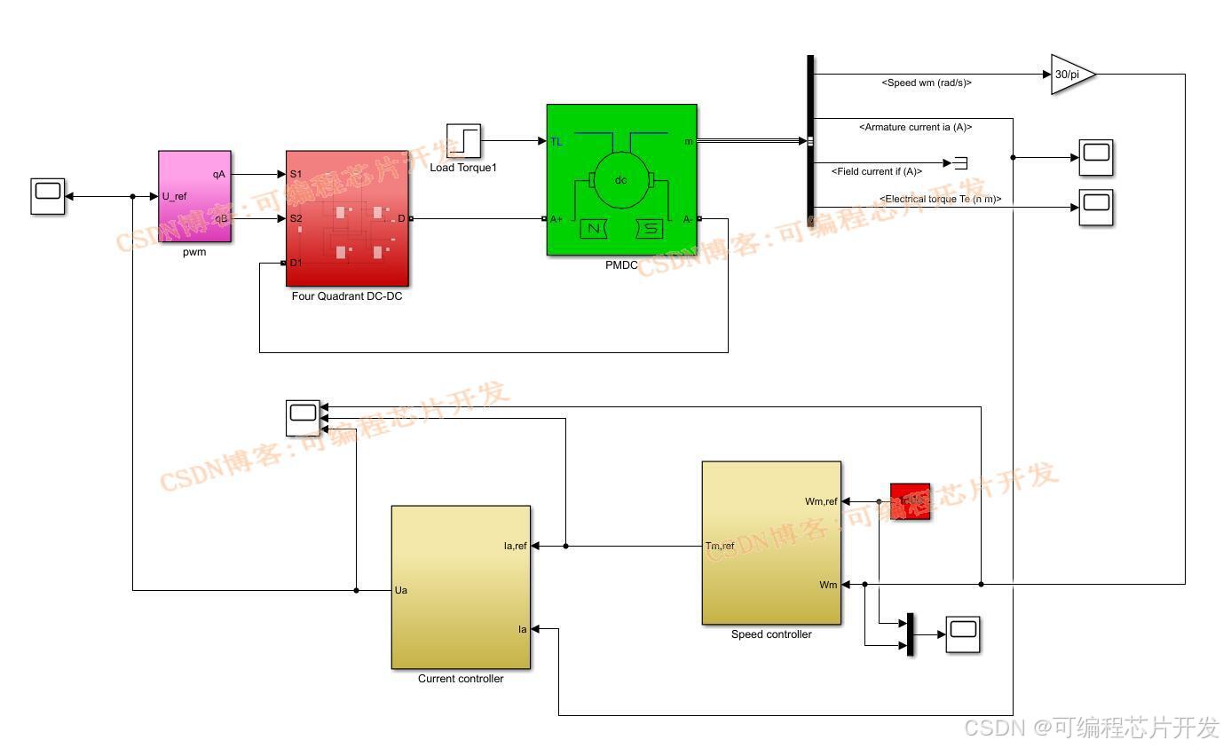 基于PID控制器和四象限DC-DC功率转换器的永磁直流电机速度控制系统simulink建模与仿真。系统包括电流PI控制器,速度PI控制器,四象限DC-DC功率转换器,PWM模块以及永磁直流电机五个部分。