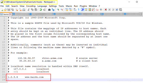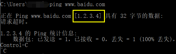 再次ping www.baidu.com 时会发现解析的ip变为你hosts文件中的了(当然了,访问不了)。