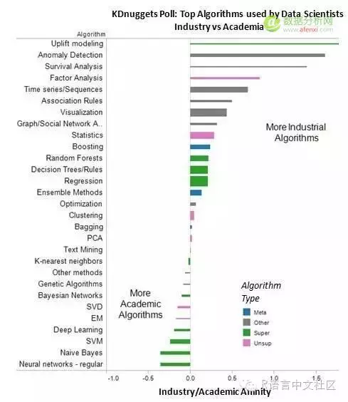 图 3:KDnuggets 投票:最常被数据科学家使用的算法:产业界 VS 学术界
