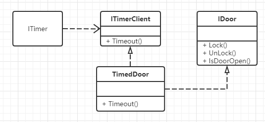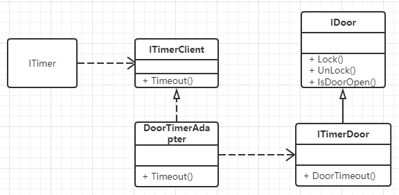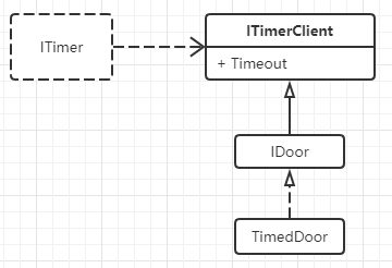 当ITimedDoor想要向ITimer对象注册一个超时请求时,它就创建一个DoorTimerAdapter并且把它注册给Timer。当Timer对象发送TimeOut消息给DoorTimerAdapter时,DoorTimerAdapter把这个消息委托为TimedDoor。