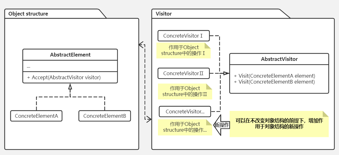 - 对象结构:对元素对象进行集合存储,向外提供对元素对象的添加、删除等操作,一般会提供一个方法,参数是访问者对象,通过访问者对象的Visit方法,对集合中元素进行遍历调用。