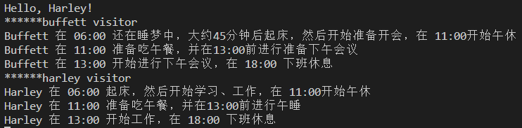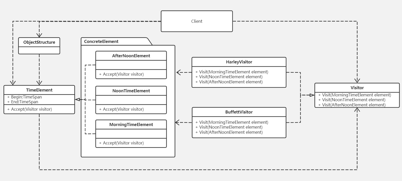 因为早中晚是相对稳定的时刻,我们可以将早中晚三个时刻声明三个元素对象,把Harley、Buffett声明为两个具体访问者对象,然后会在具体访问者对象中描述访问者的具体行为。