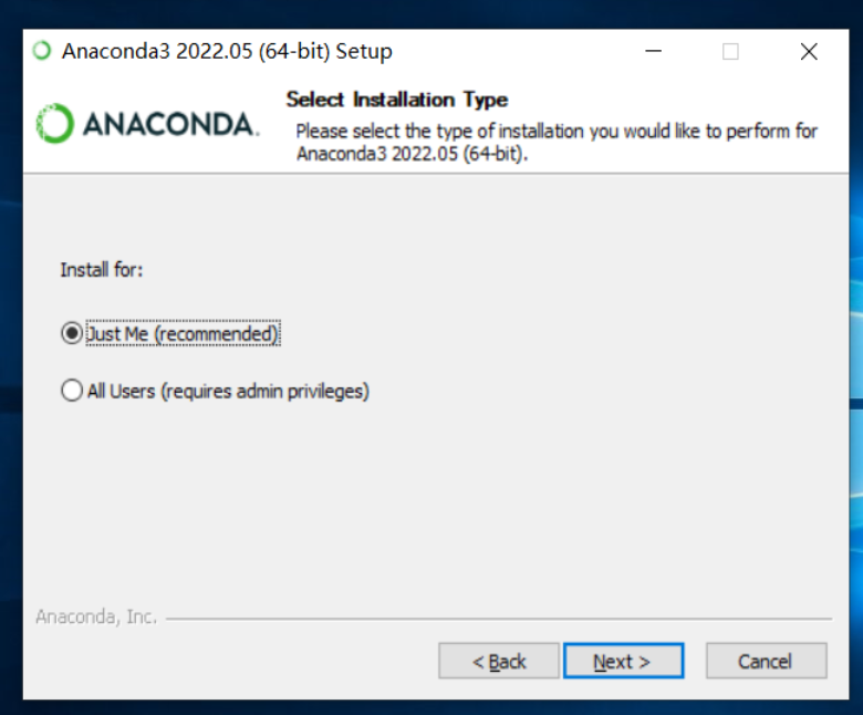 如果想当前用户使用就选Just Me,如果想全部用户使用就选All Users,点击Next。