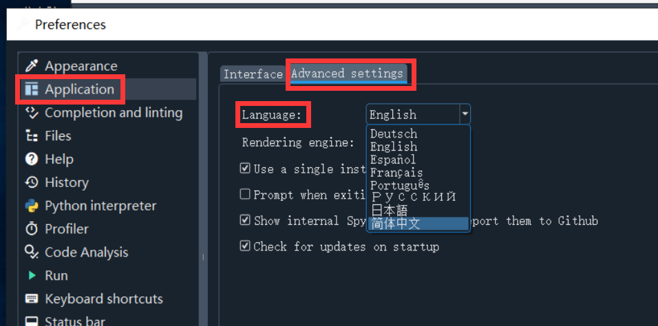 在Tools - Preferences - Application右侧窗口Advanced settings下的language可以切换成简体中文,然后点击右下角的Apply应用。