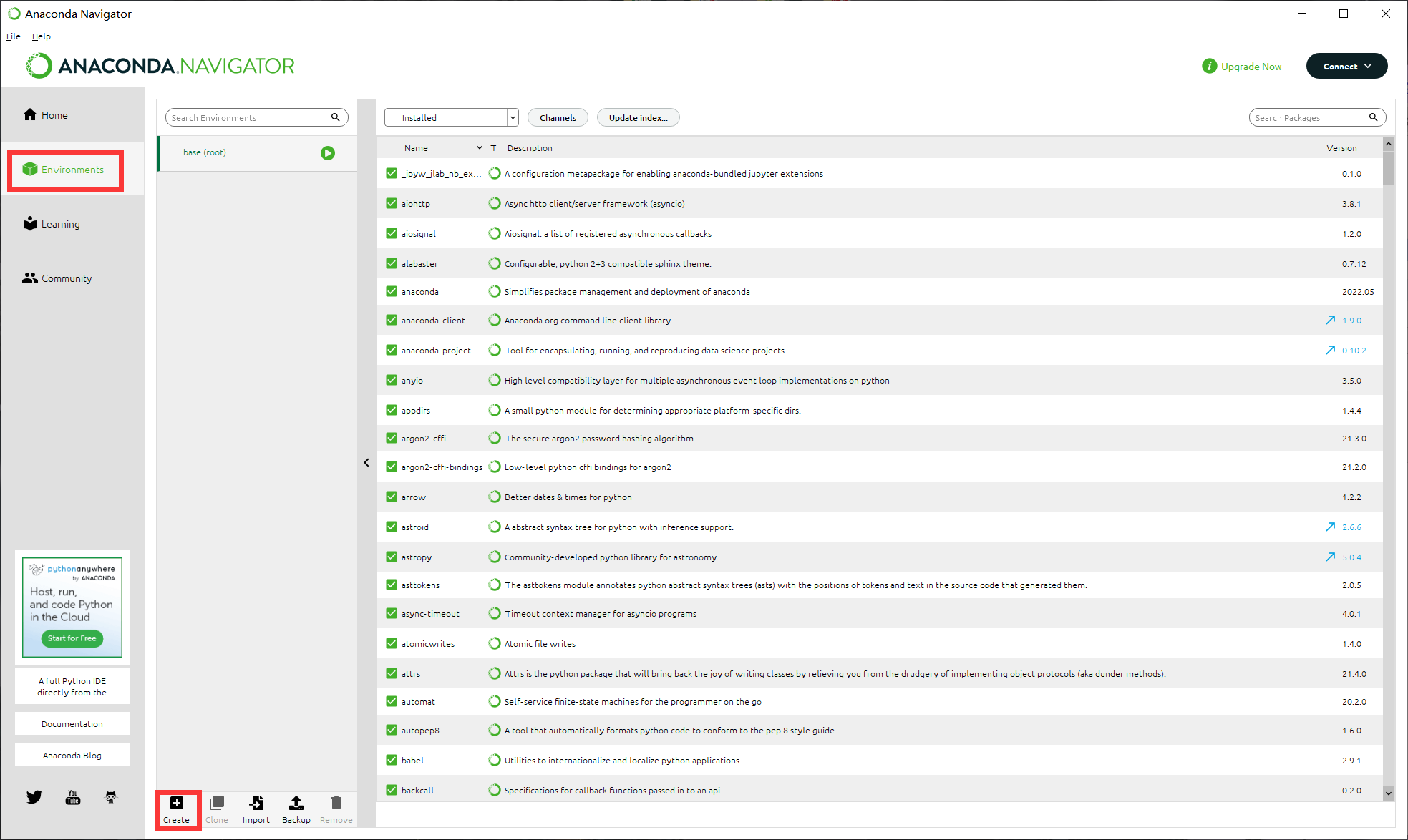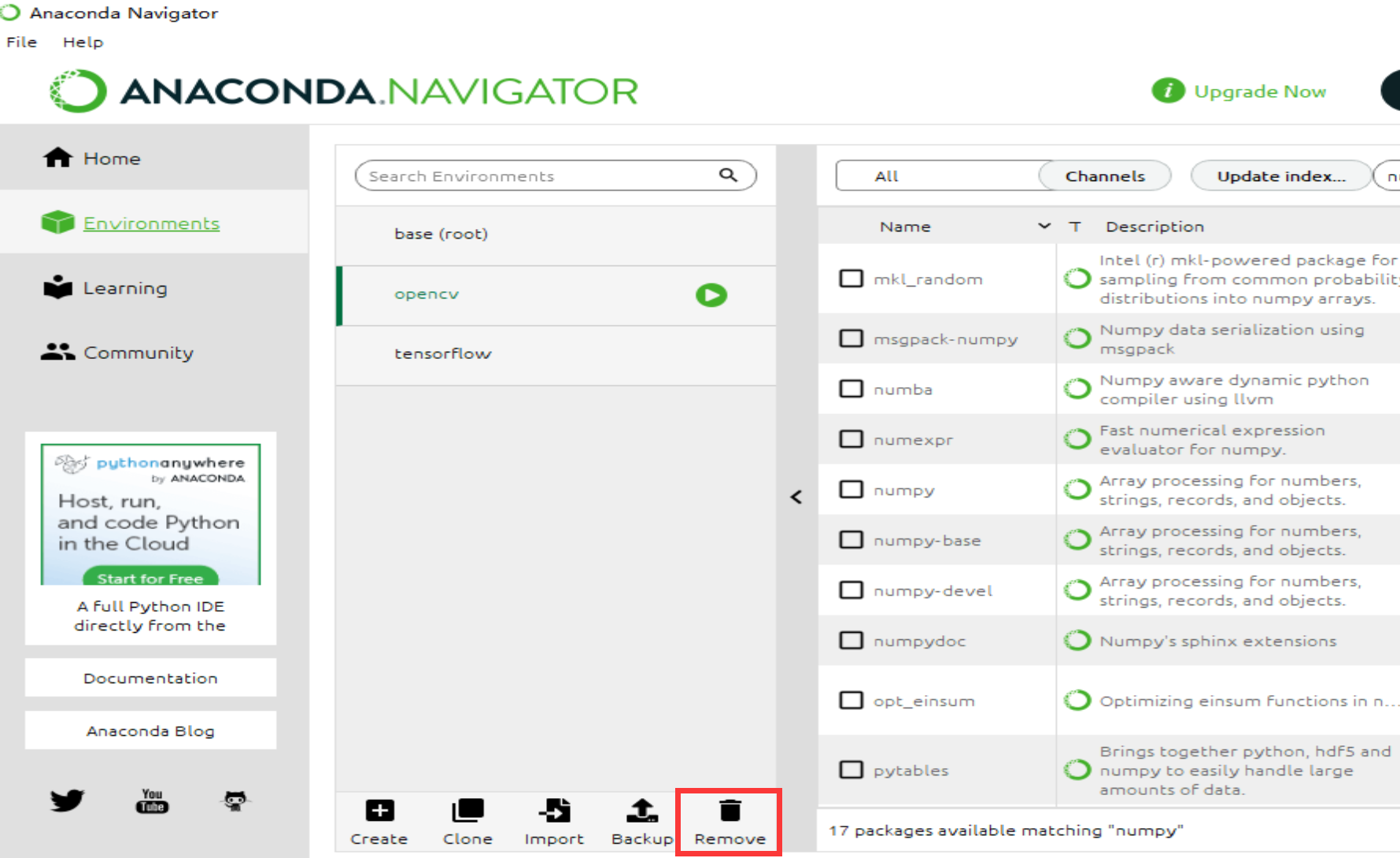 或者进入到Andaconda的GUI界面,选中对应环境点击下方的Remove按钮进行删除。