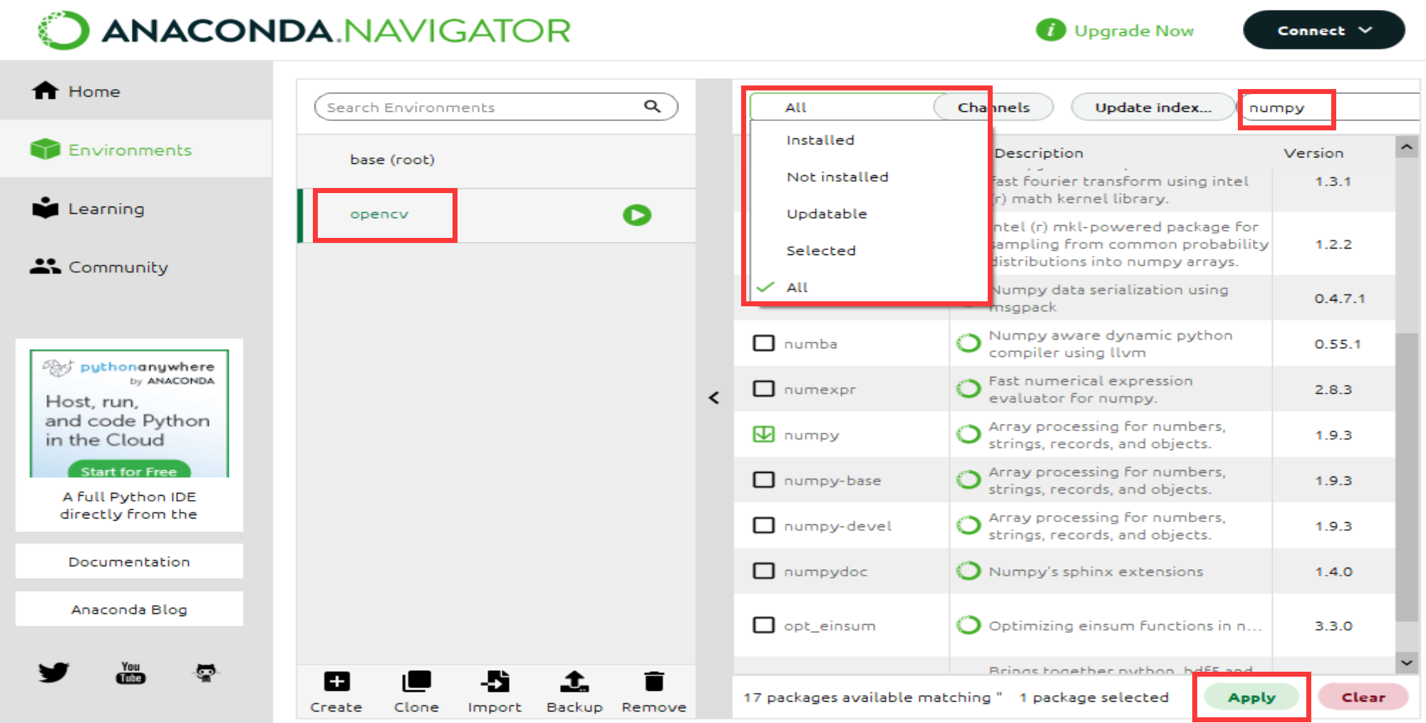 在环境创建完成后,我们点击刚刚创建的环境opencv,点击右侧Channels左边的框框,选中All。